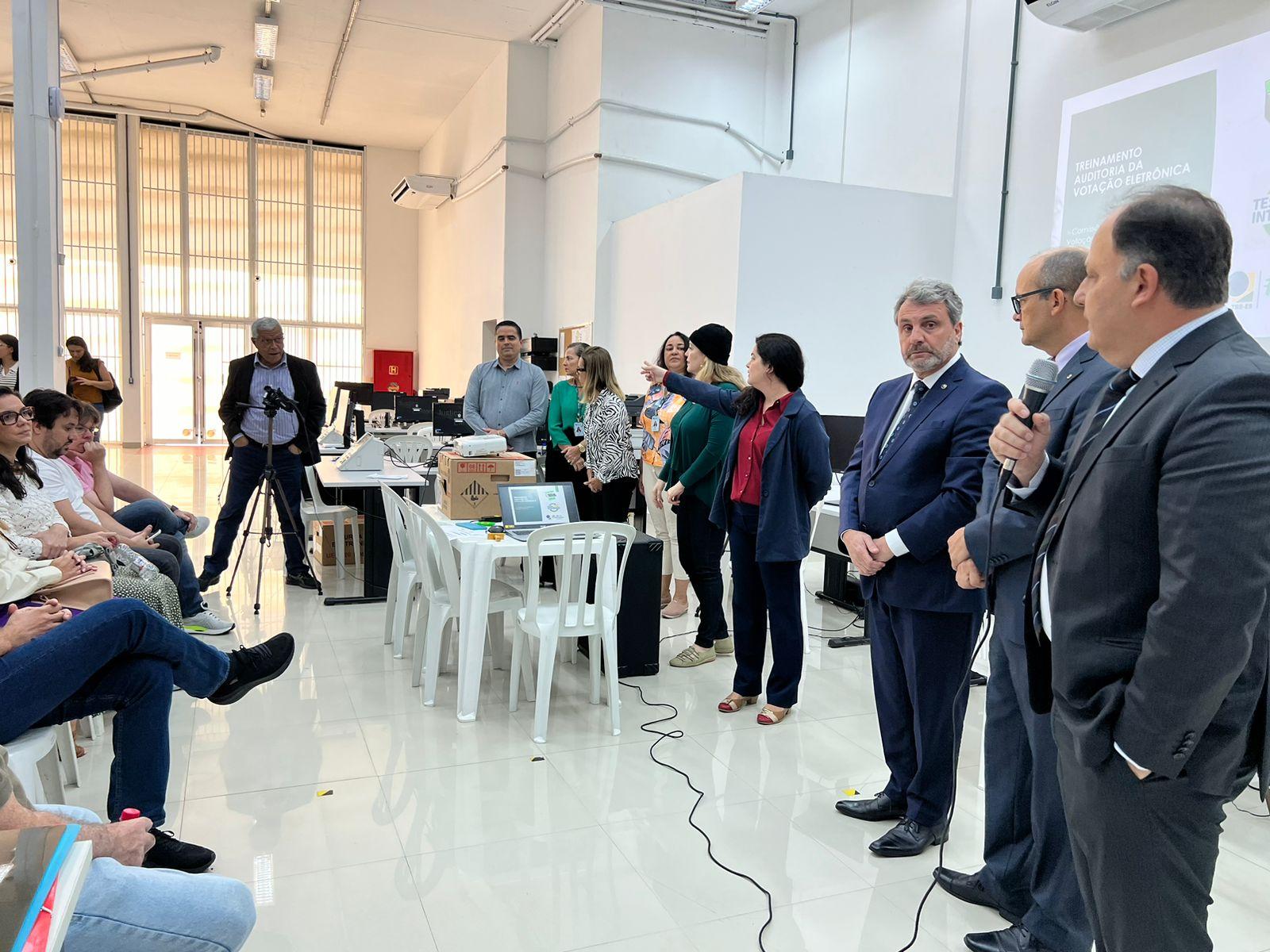 O treinamento para a Auditoria do Teste de Integridade com Biometria contou com a presença do juiz Anselmo Laghi Laranja, presidente da Comissão de Auditoria da Votação Eletrônica (CAVE), que reforçou a importância de mais uma ação para validação do processo de votação, destacando a transparência do pleito que ocorrerá no próximo domingo (06). Acompanharam a capacitação Rogério Rodrigues de Almeida, juiz auxiliar da Corregedoria, designado para auxiliar os trabalhos da Comissão de Auditoria relativos ao Teste de Integridade com Biometria e o procurador regional eleitoral Paulo Guaresqui.